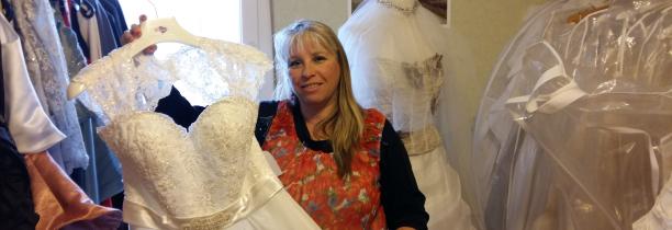 Photo : Sylvie, nous montre une robe de sa collection proposée en location.