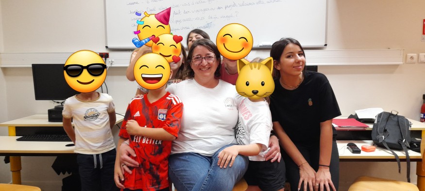 Photo : Sandrine, au centre, avec les élèves.