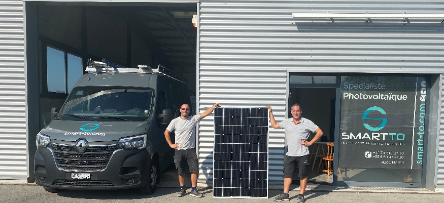 Photo : Mauricio (à gauche) et Geoffrey (à droite) avec un panneau photovoltaique prêt à être installé chez vous.